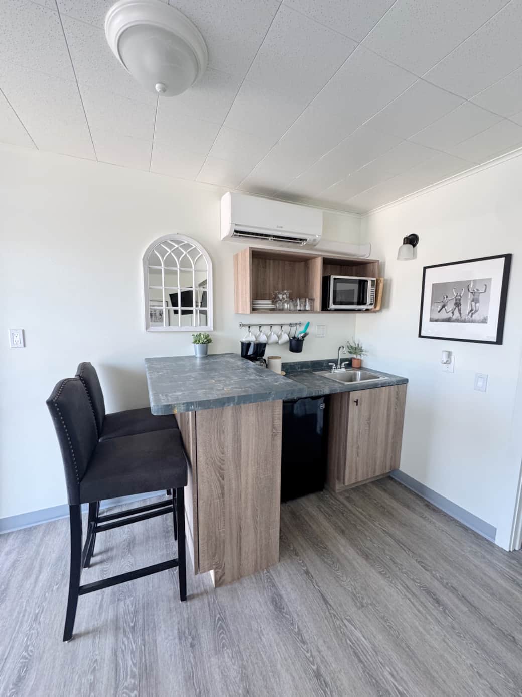 A kitchen features a wet bar, small refrigerator, microwave, sink, and most importantly a coffee maker.
